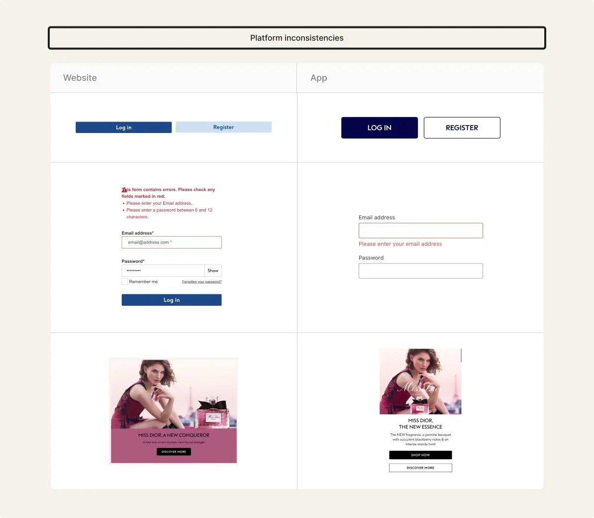 Alongside foundational differences, core components also varied across platforms. Buttons used different colours, sizes, and states. Form inputs and error messaging were presented differently between web and app. Card components shared similar content but differed in layout, background treatment, and actions, with additional buttons or text variations depending on platform.