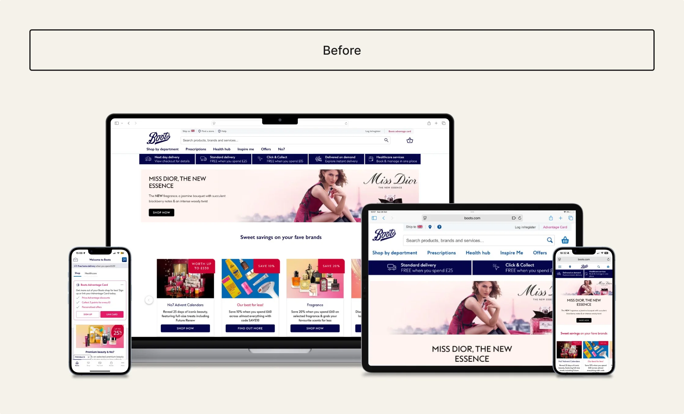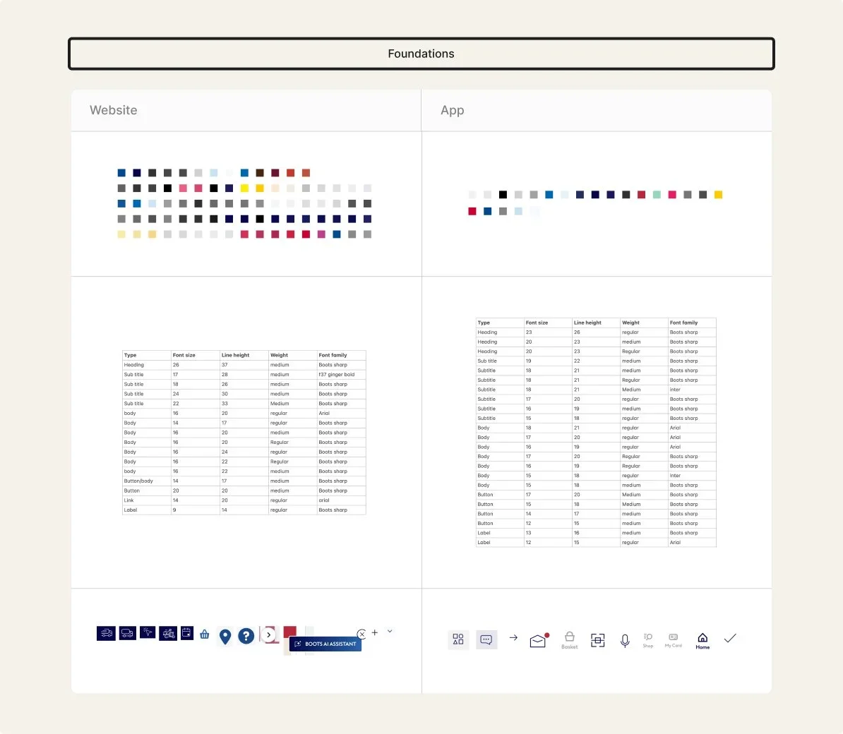 This section outlines how the problem space was understood through auditing Boots’ web and app interfaces, reviewing foundations, components, and accessibility considerations to identify inconsistencies and opportunities for standardisation.