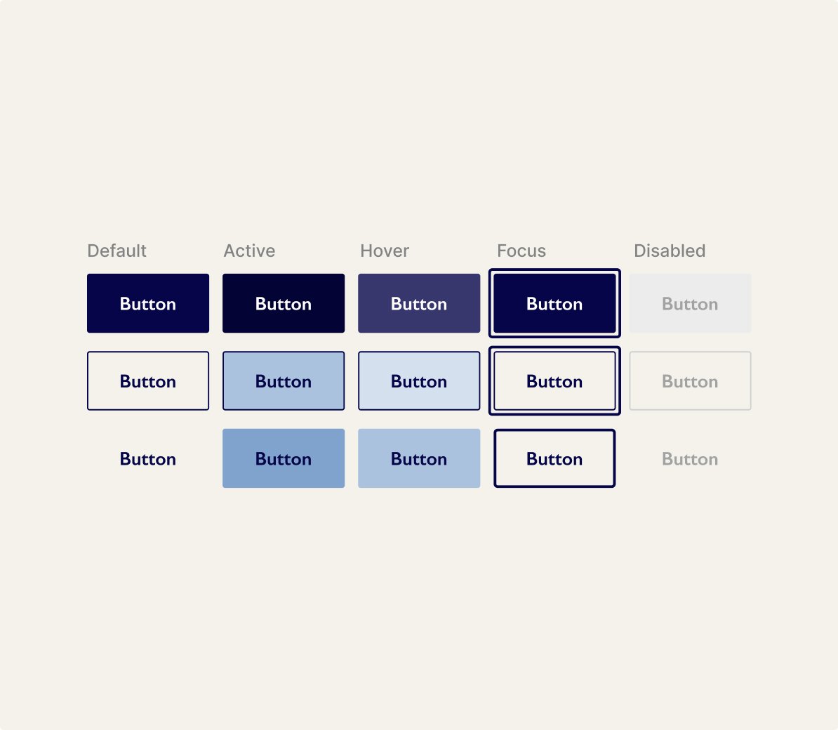 To support scalable outputs, core components were standardised using shared foundations, with clear interaction states, accessibility considerations and consistent spacing across responsive layouts. This section focuses on the button component, highlighting decisions that improved consistency, usability and cross-platform reuse.