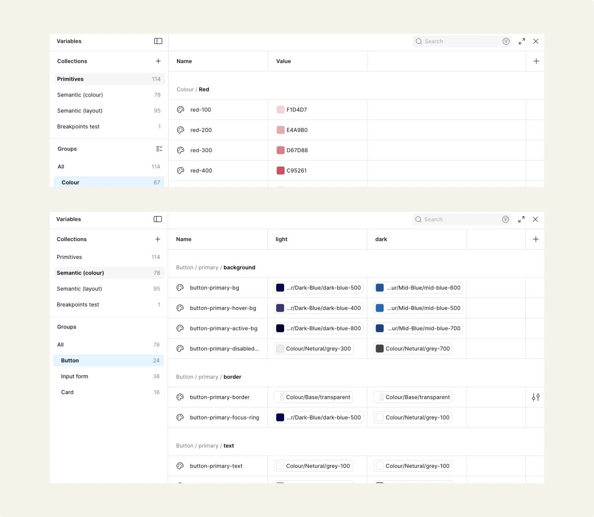 Components and tokens were structured in Figma using reusable foundations (colour, type, spacing and radius). Additions were reviewed against accessibility guidance and system principles to maintain consistency and flexibility across light and dark modes. Components were designed with states, responsiveness and token usage in mind so they could translate clearly into implementation.