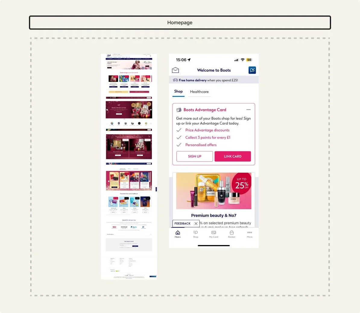 Following advice to review both web and app together, I compared how key journeys translated across platforms. While the overall visual direction was similar, layout structure, content sections, and component behaviour were not fully aligned. Some sections and patterns existed on one platform but not the other, and responsive behaviour was inconsistent between contexts.