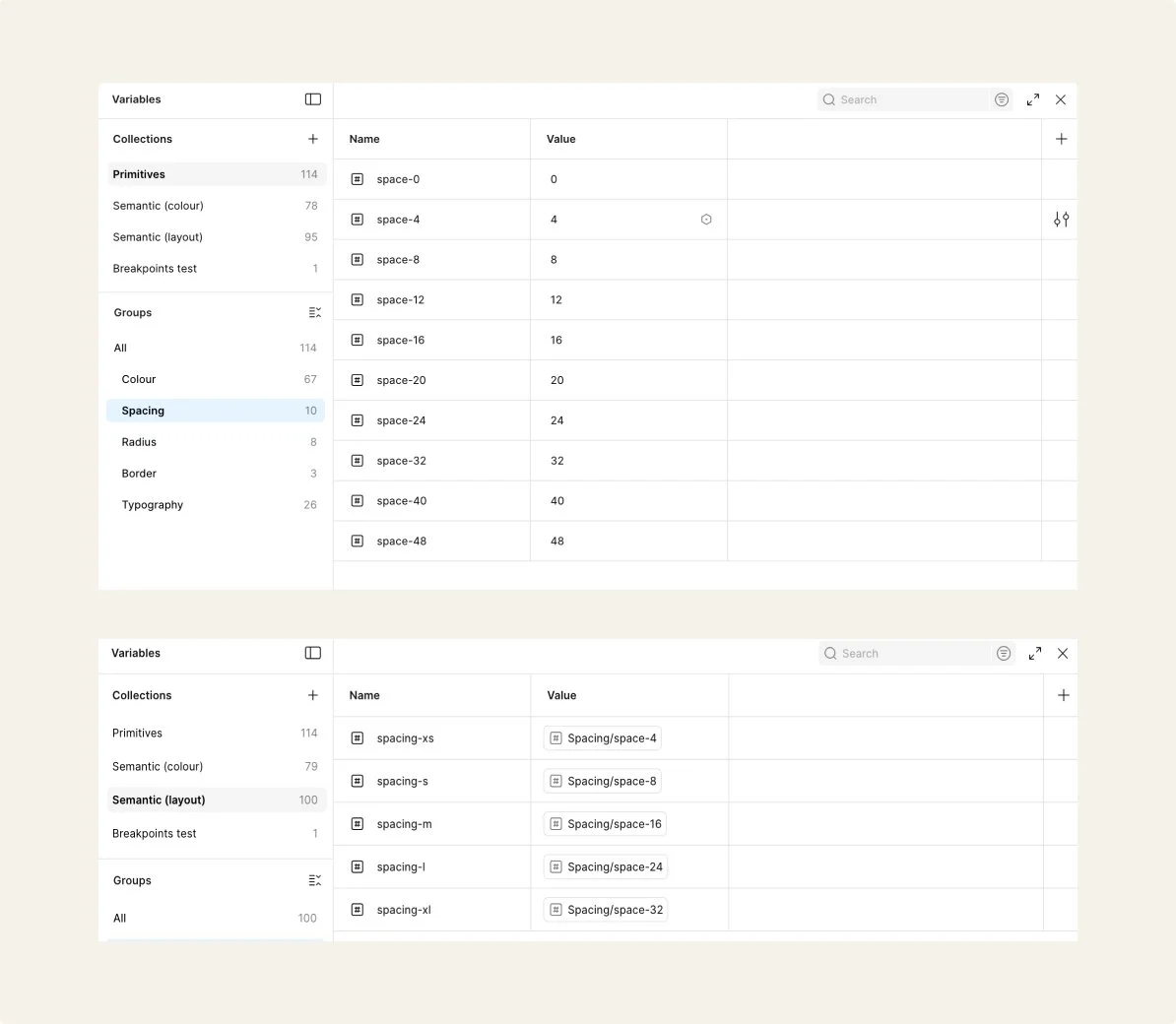 I added all the spacing values I needed in the primitives, I also added in radius and border values too, then I assigned the spacing to semantic values for padding and then radius for border semantics and radius for the corner semantics.