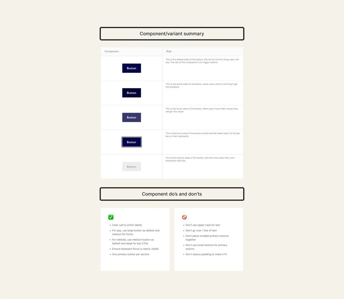 Usage guidance sits alongside each component within the Figma file, including variant roles, states, and do/don’t examples. In a production environment, this would be published within a shared design system library.