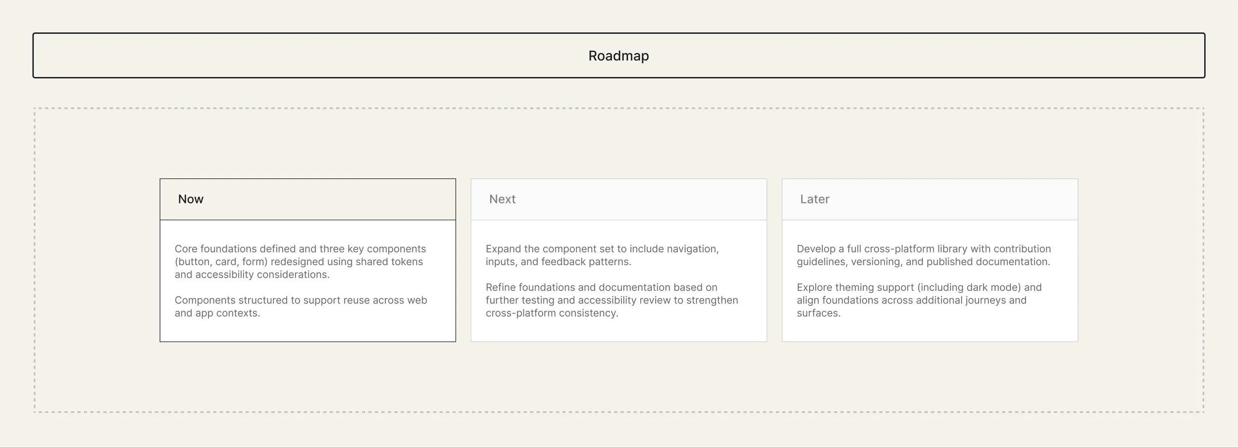 Expand components, refine foundations through testing, and evolve into a documented, versioned cross-platform library with theming support.