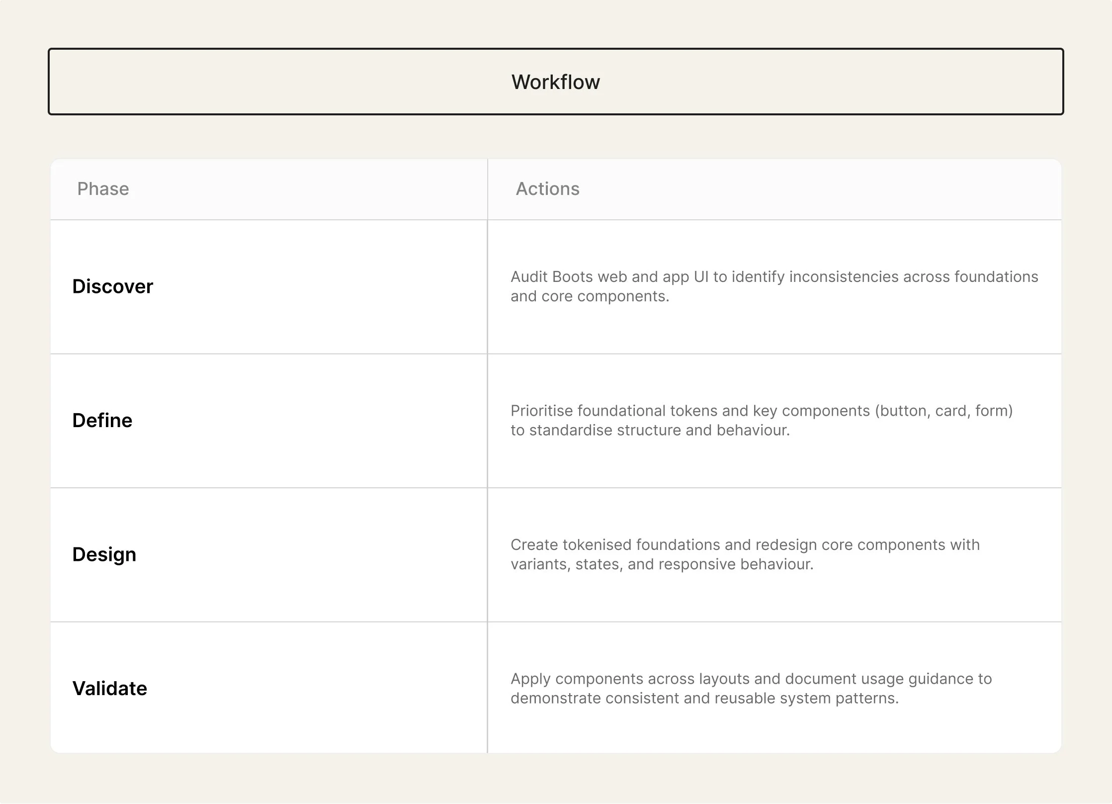 Established how a structured system improves consistency, reuse, and scalability across Boots digital interfaces.