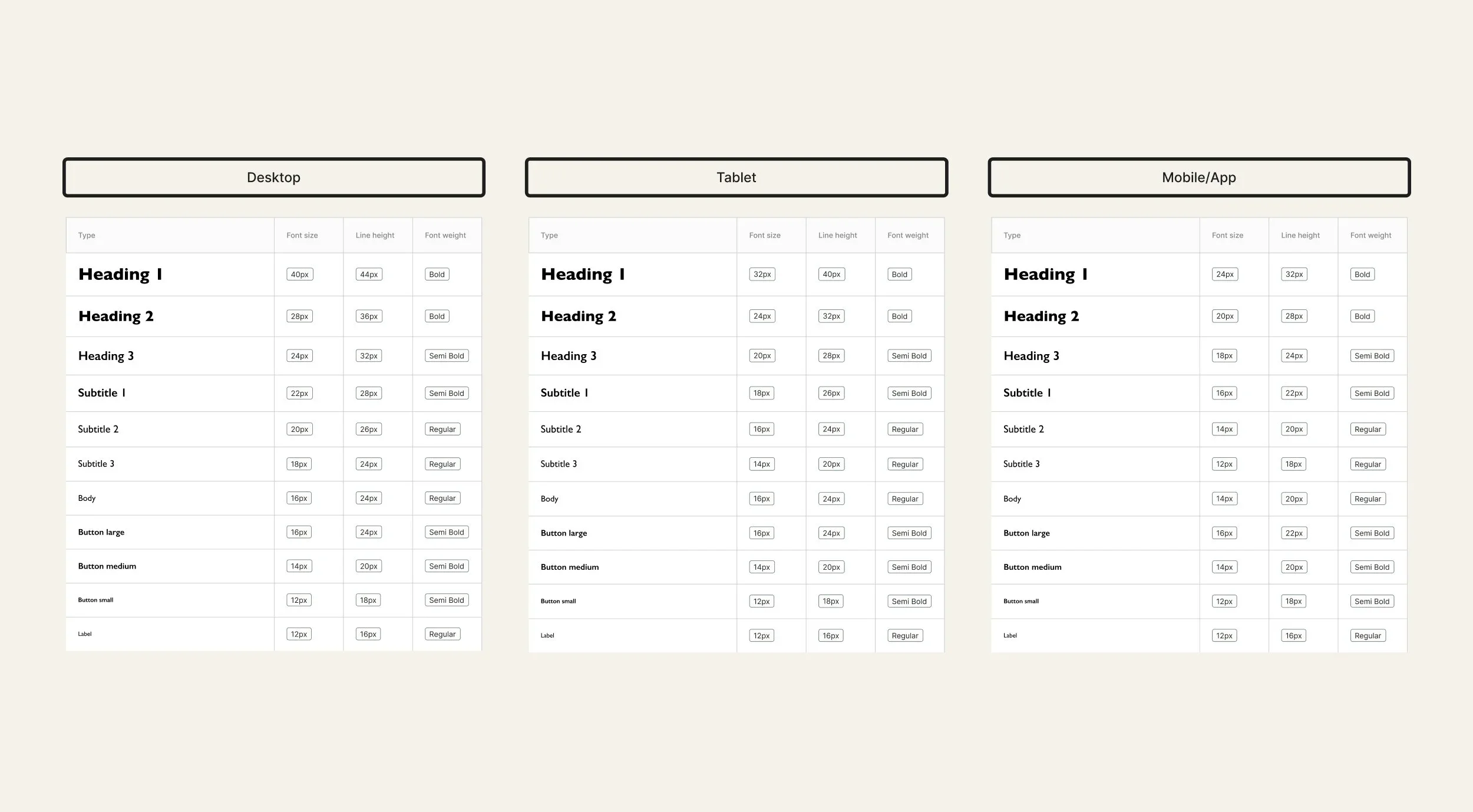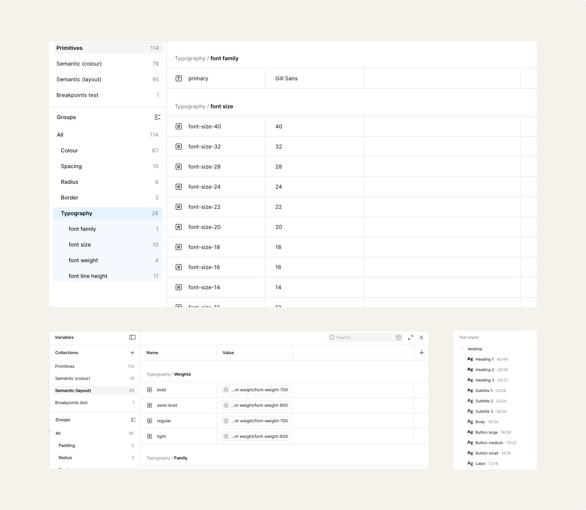 This was set up first in primitive tokens, including the font family, size, weights, line heights, then it was linked to semantic values linking to each type scale including heading, subtitles, body, button text and labels for all interfaces including desktop, tablet, mobile/app. This was then added into text styles,