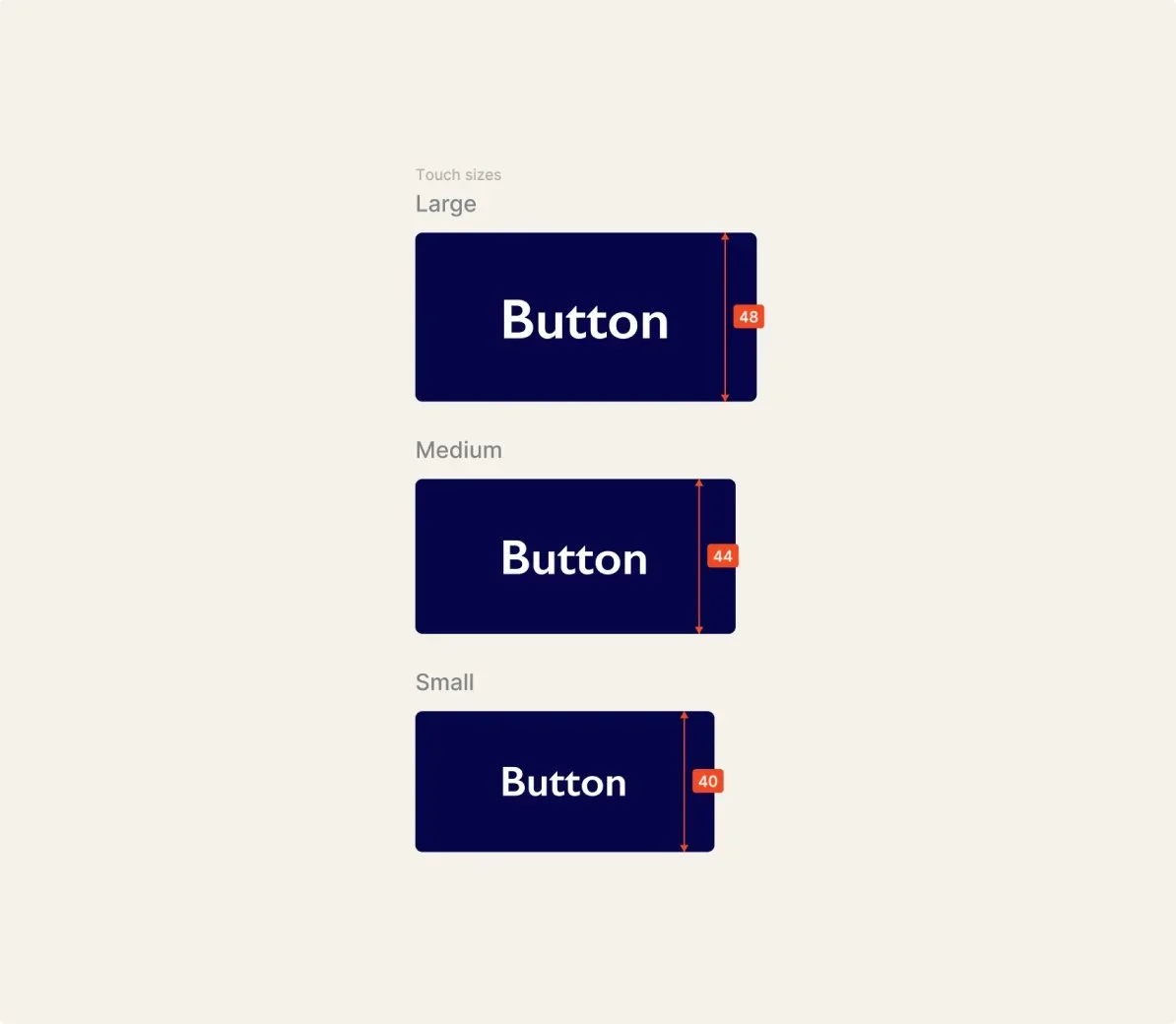 I defined button sizes, accessibility, and responsive behaviour to create a structure that could scale across layouts and platforms. This included reviewing text legibility, colour contrast, touch target sizes and more accessibility points, plus aligning the spacing and typography to shared foundations.