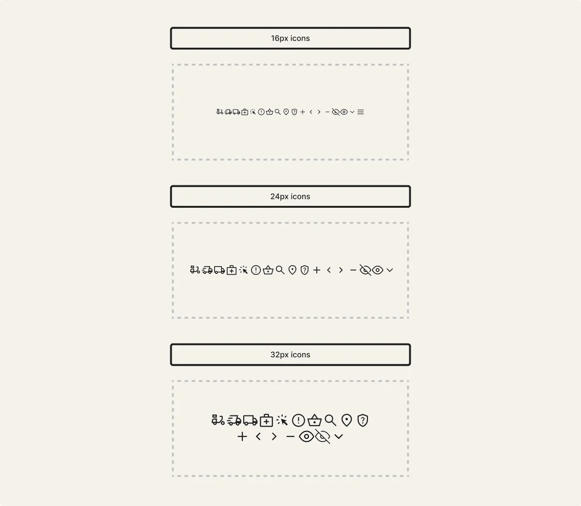Following the audit, I replaced the icon set due to inconsistent styles and visual weights across the system. I standardised the library using Material Symbols as a base, mapping existing icons to the closest available matches and aligning them to a consistent grid, stroke weight, and sizing scale.